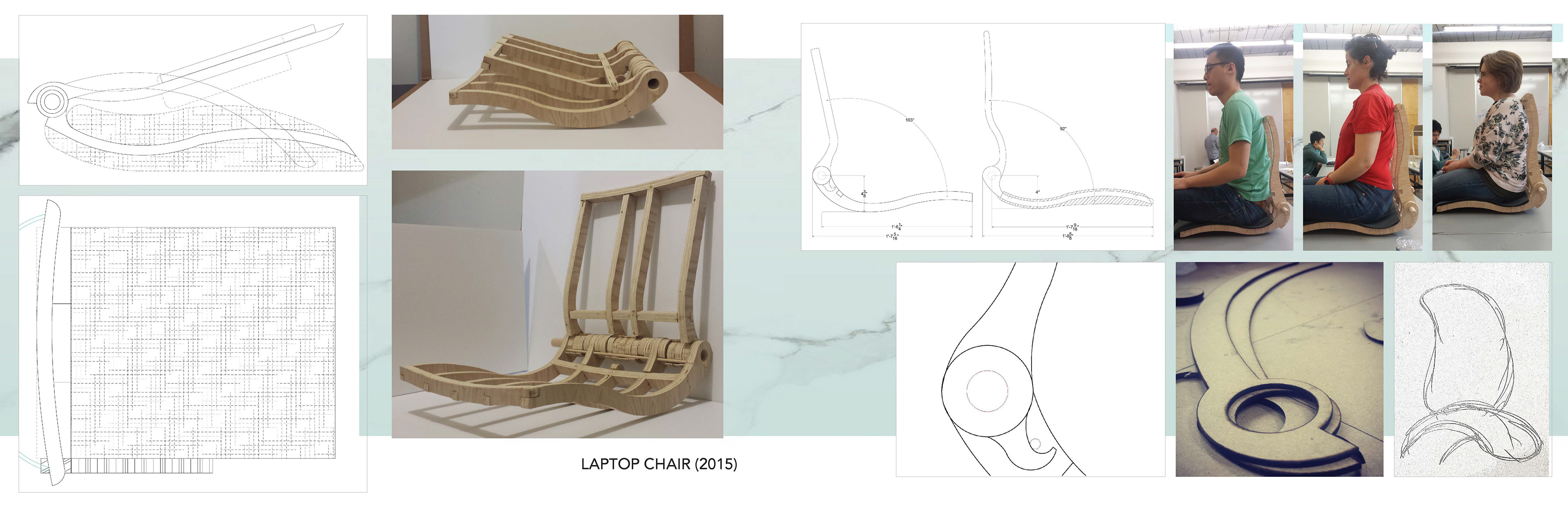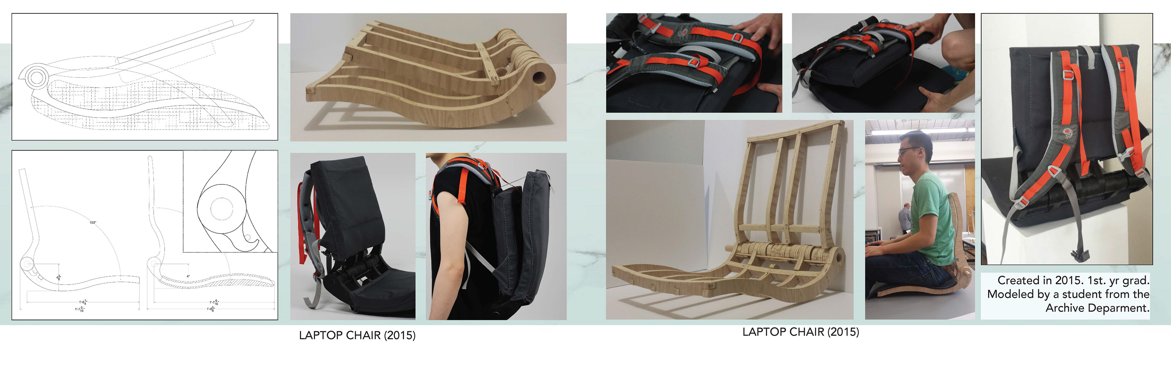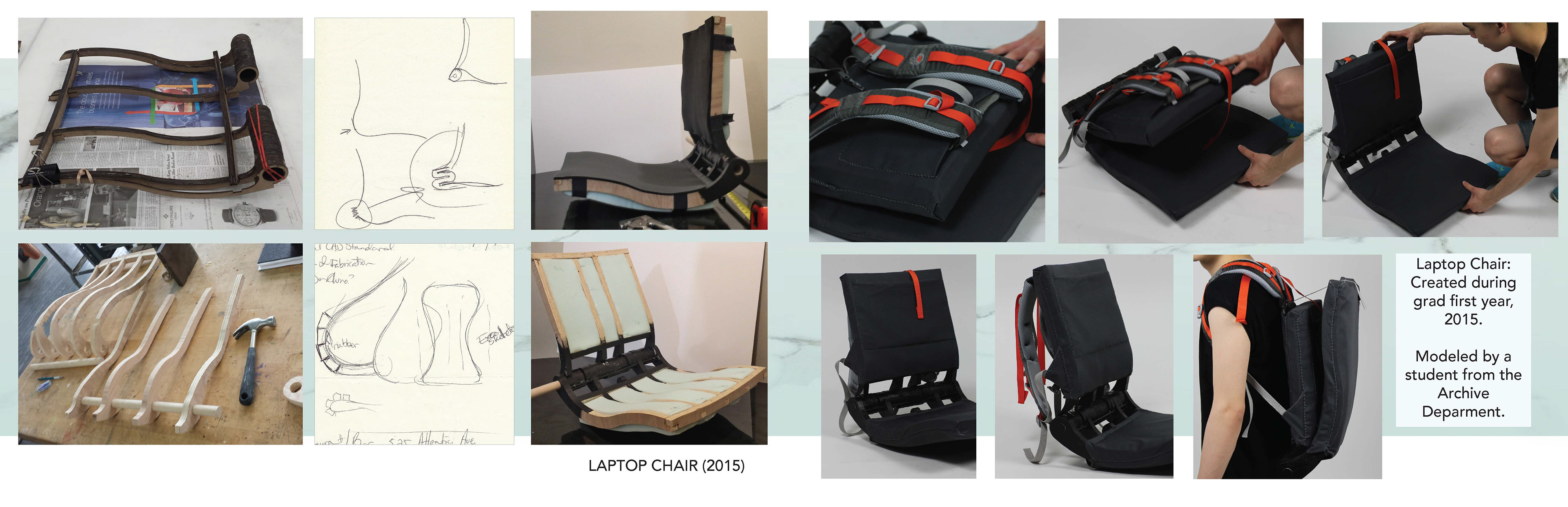 Laptop Chair (Prototype): Allows the user to work anywhere. Stores a laptop and other supplies. Easily transported as a backpack. inspired by my love for backpacks, mobility and a need to avoid clutter.